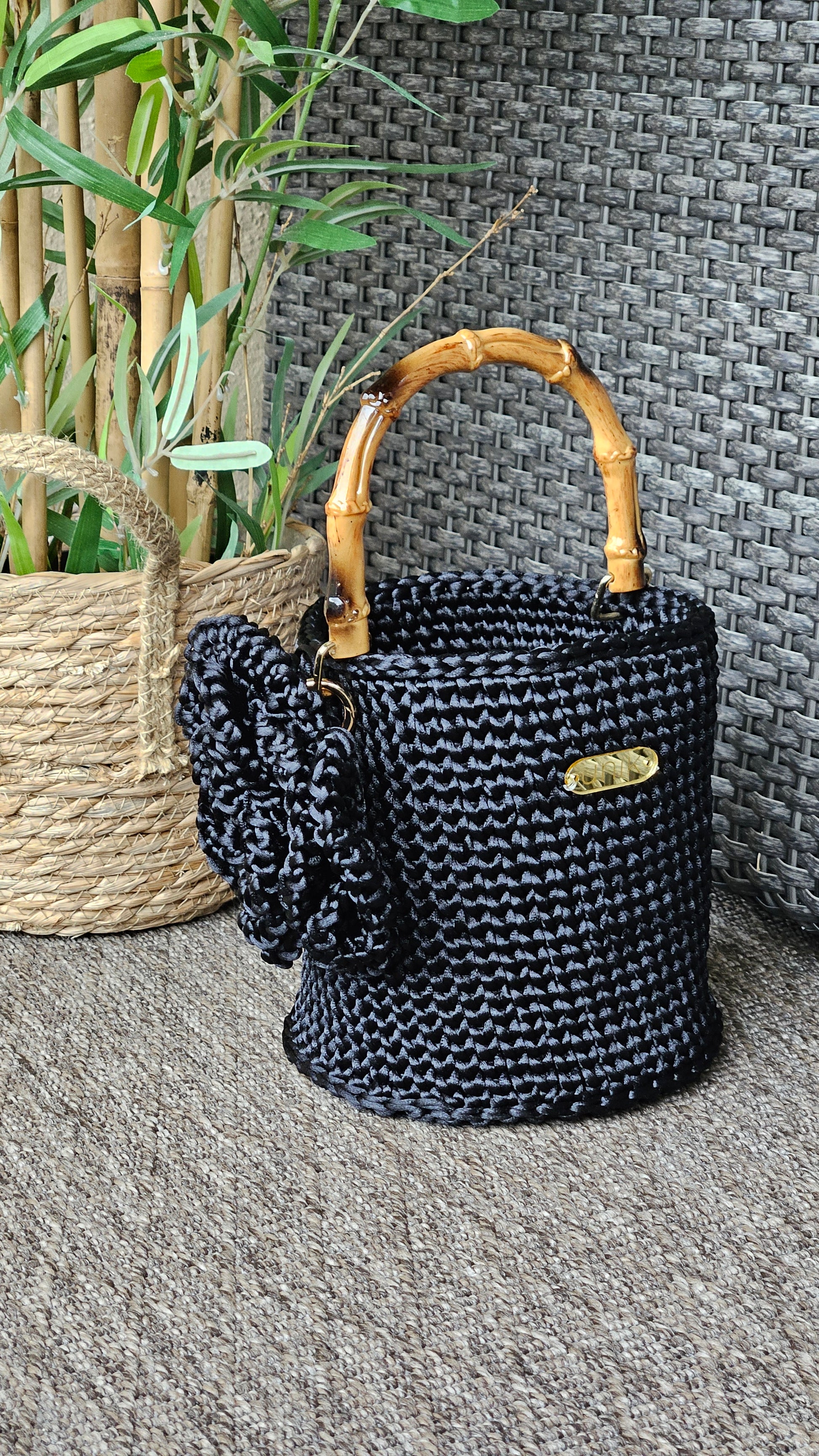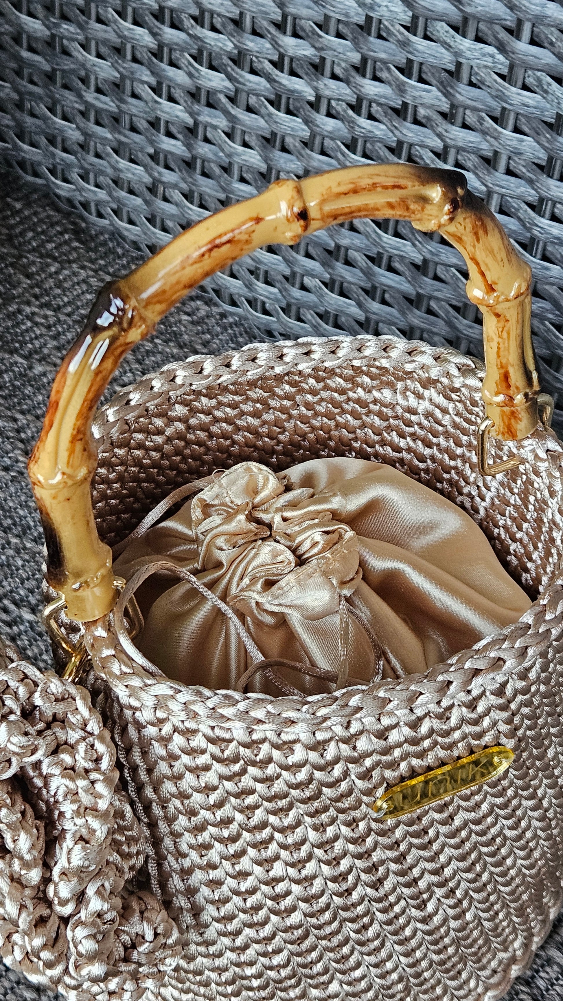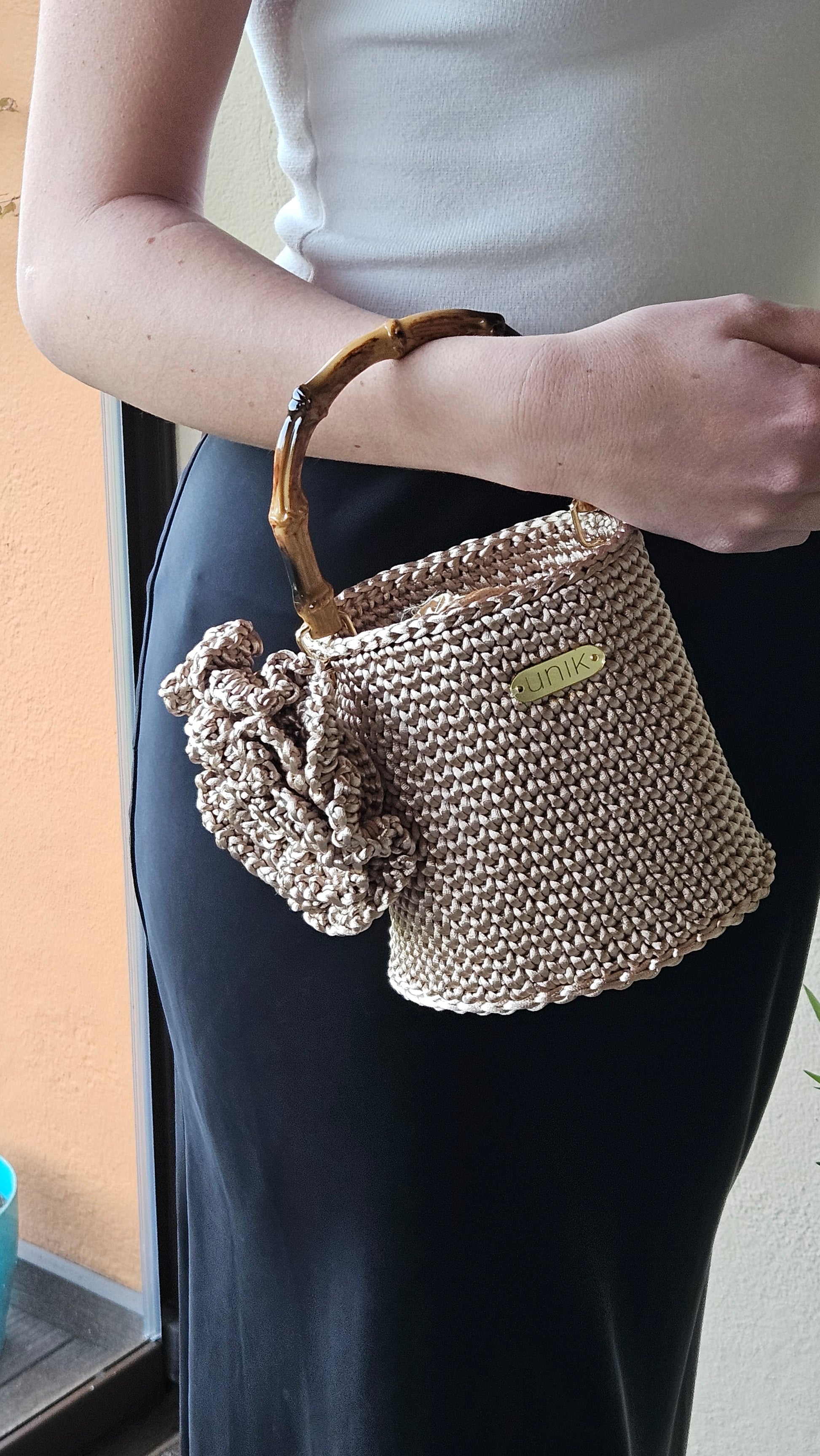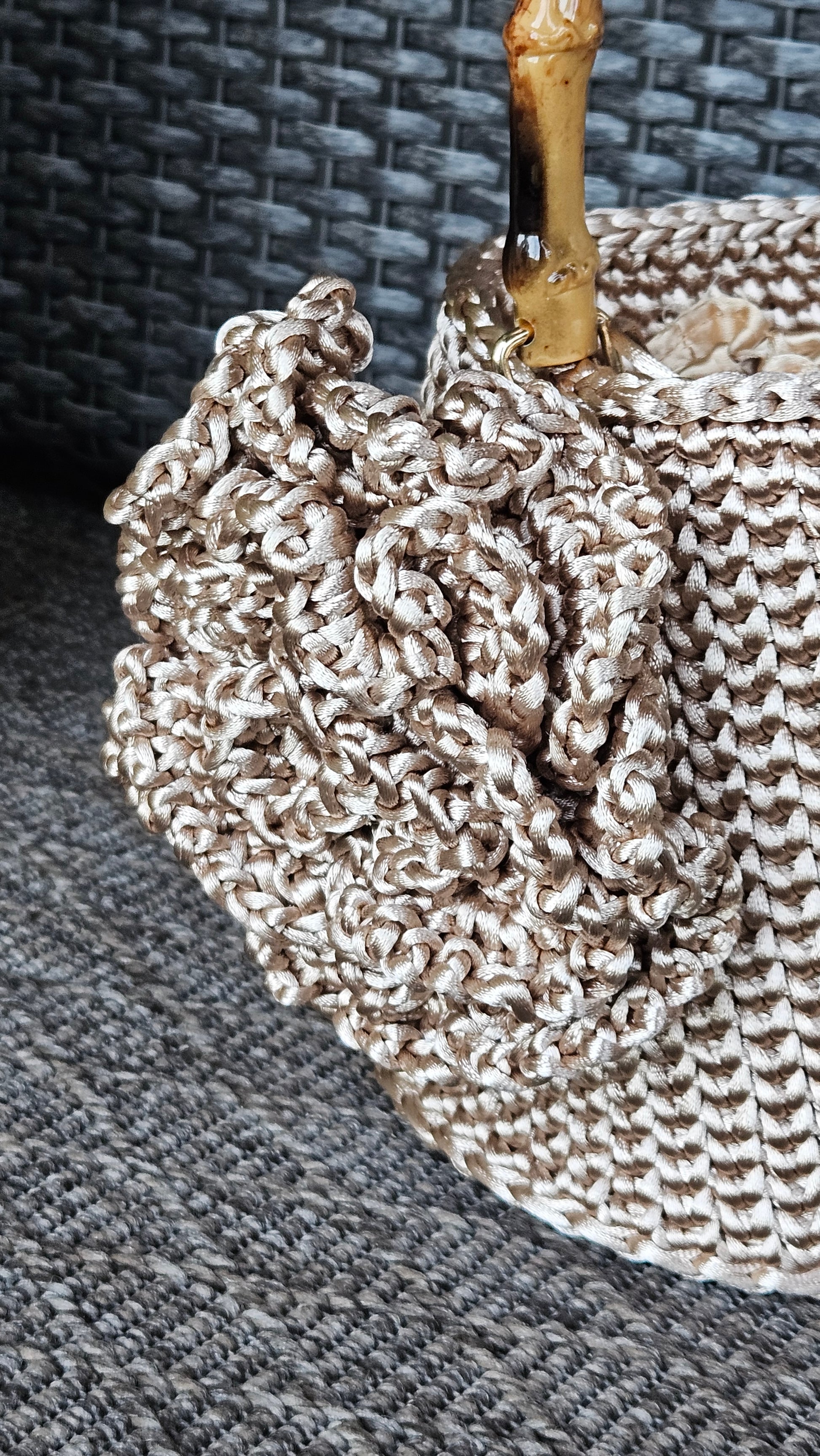 Bolso de ganxet amb forma de con, teixit a mà amb fil satinat i un disseny pensat per destacar per la seva elegància i originalitat. La seva estructura còmoda i lleugera el converteix en l’accessori ideal.