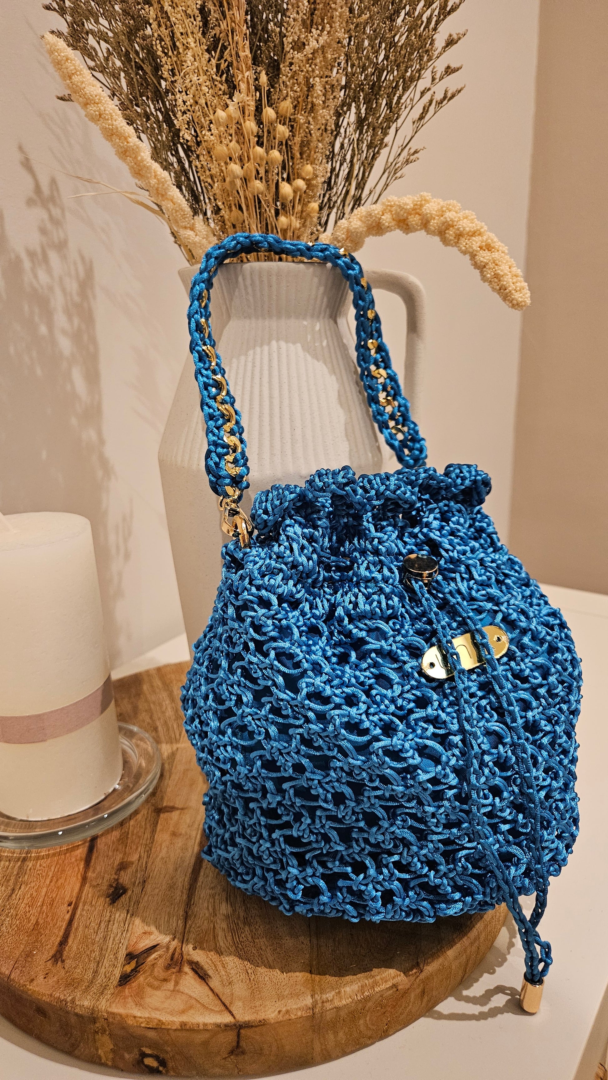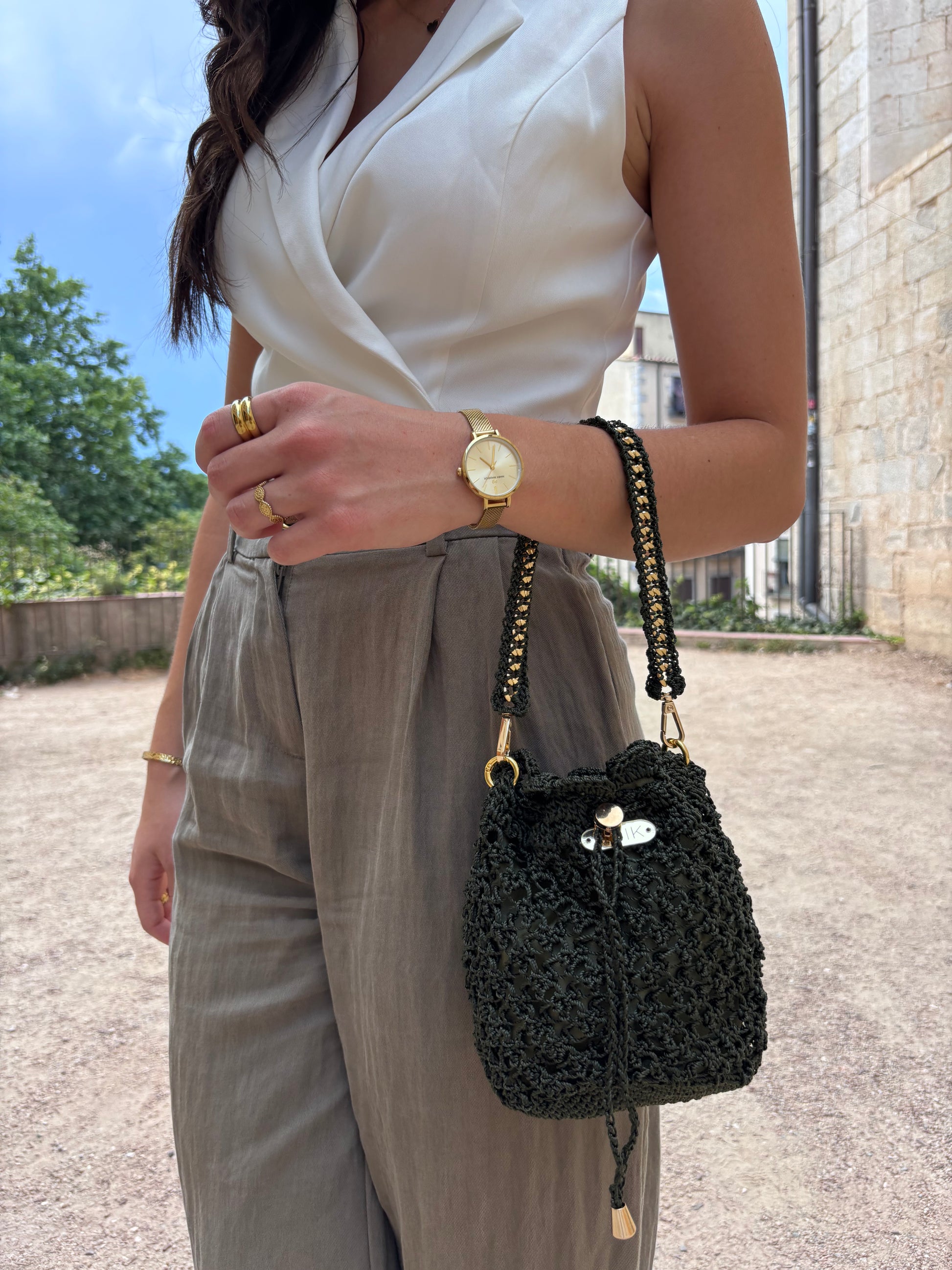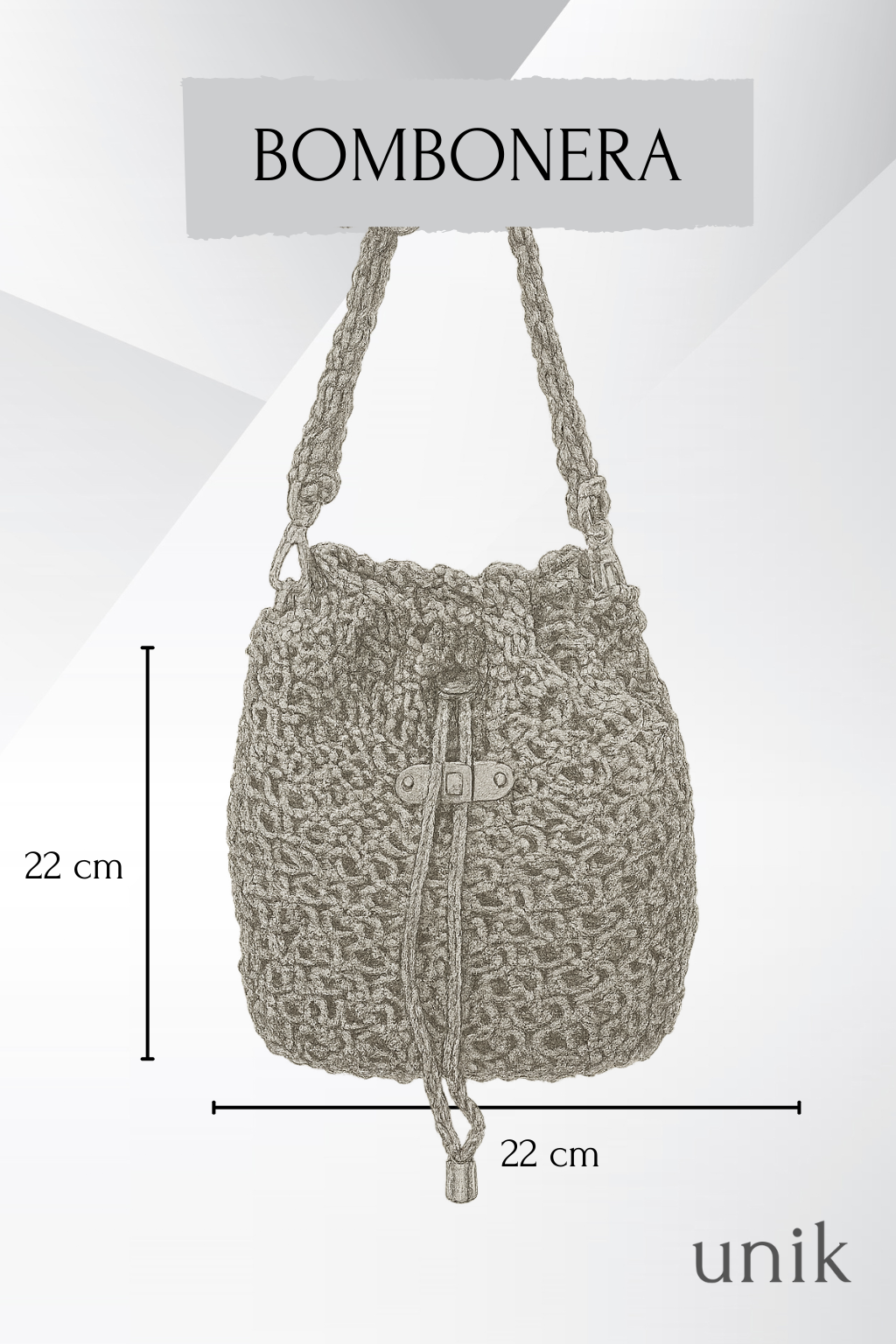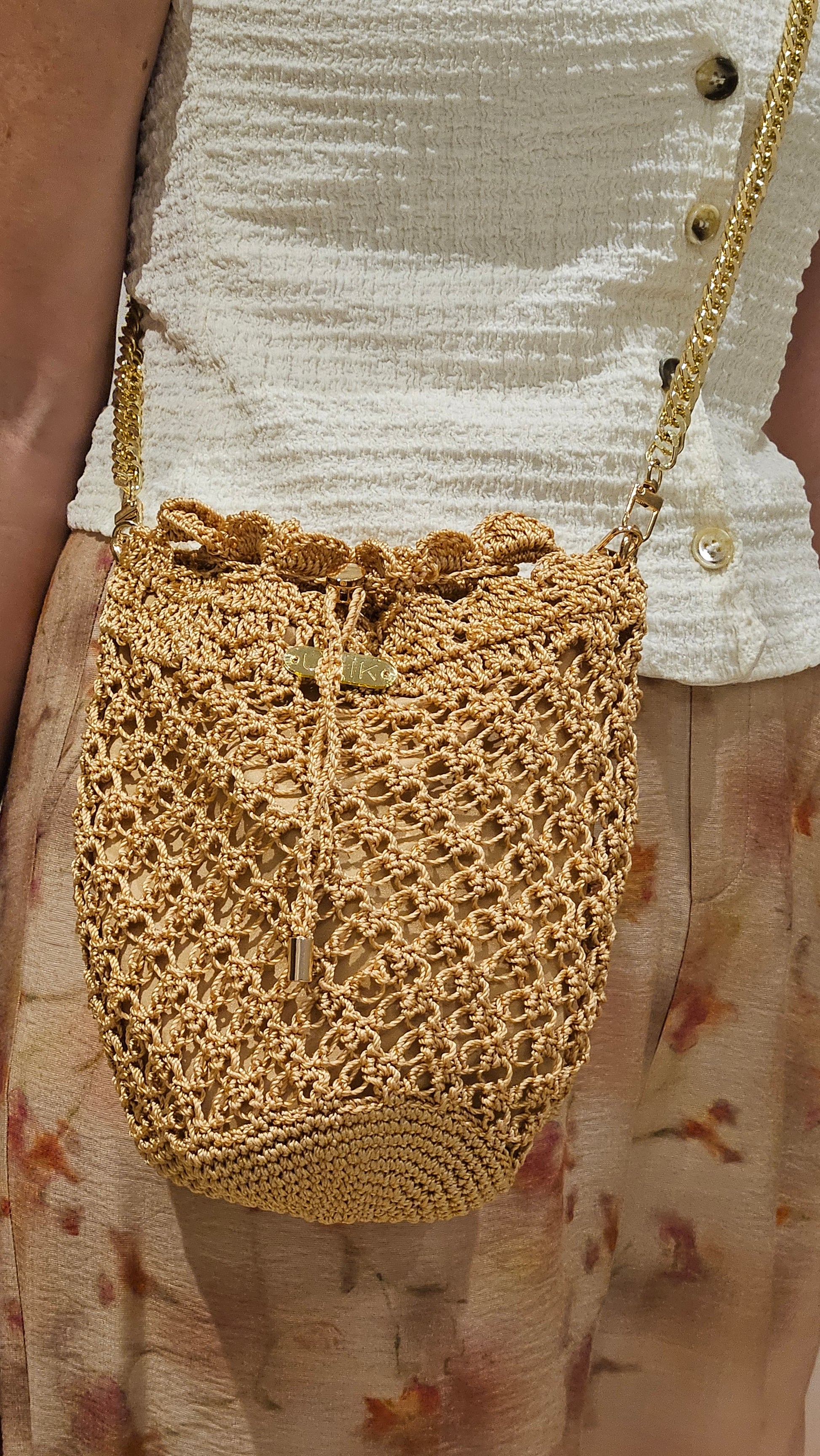 Aquest petit tresor de ganxet, és l’accessori perfecte per donar un toc sofisticat i artesanal al teu look. Està teixida a mà amb un fil xampany brillant que atrapa totes les mirades, i incorpora una pràctica tanca metàl·lica daurada amb cordó ajustable.