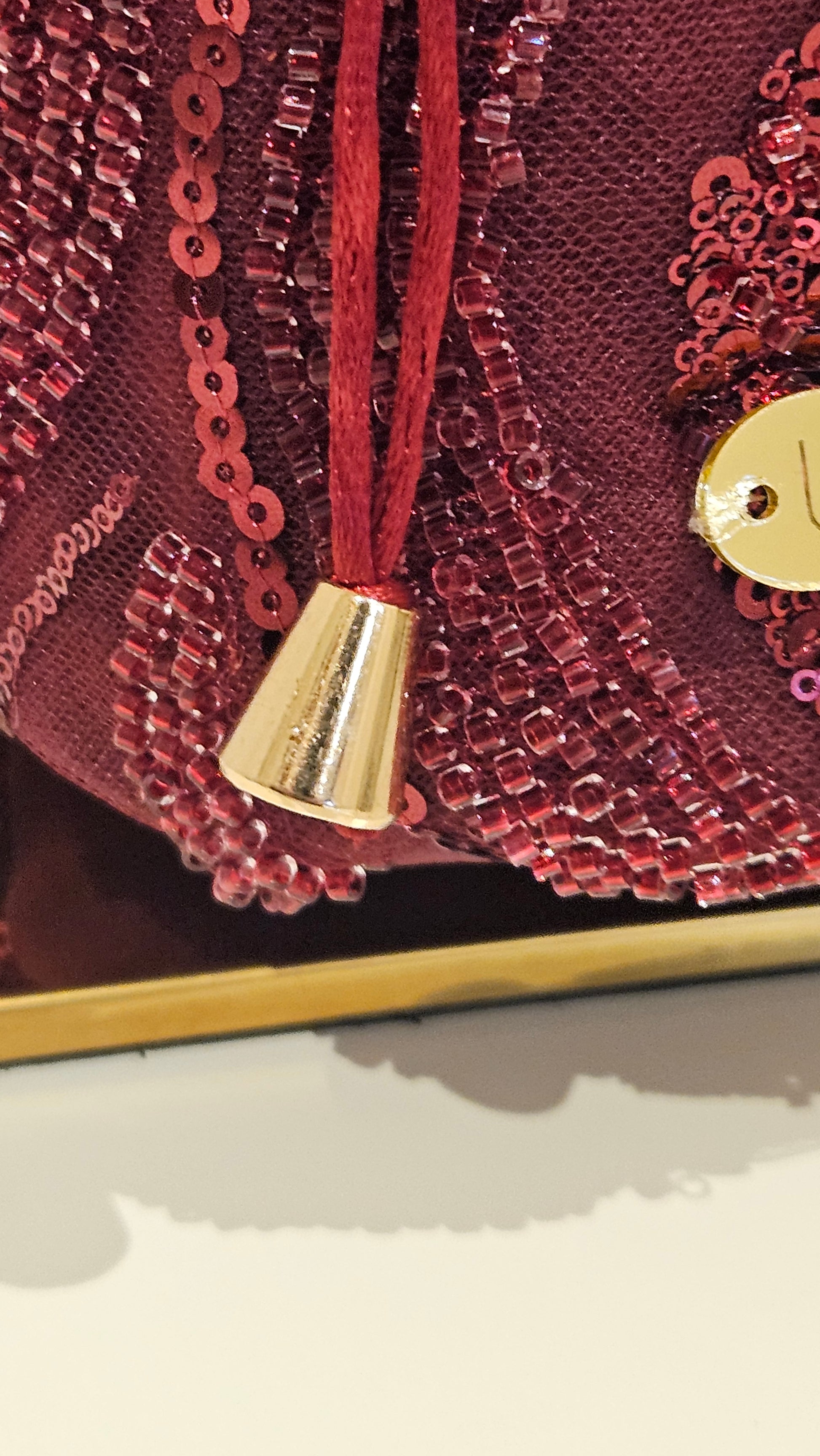 Elegant i sofisticat, aquest bolso bombonera és la peça perfecta per completar qualsevol look de nit o d’ocasió especial. Confeccionat amb teixit de vellut i decorat amb lluentons que creen un efecte brillant i únic.