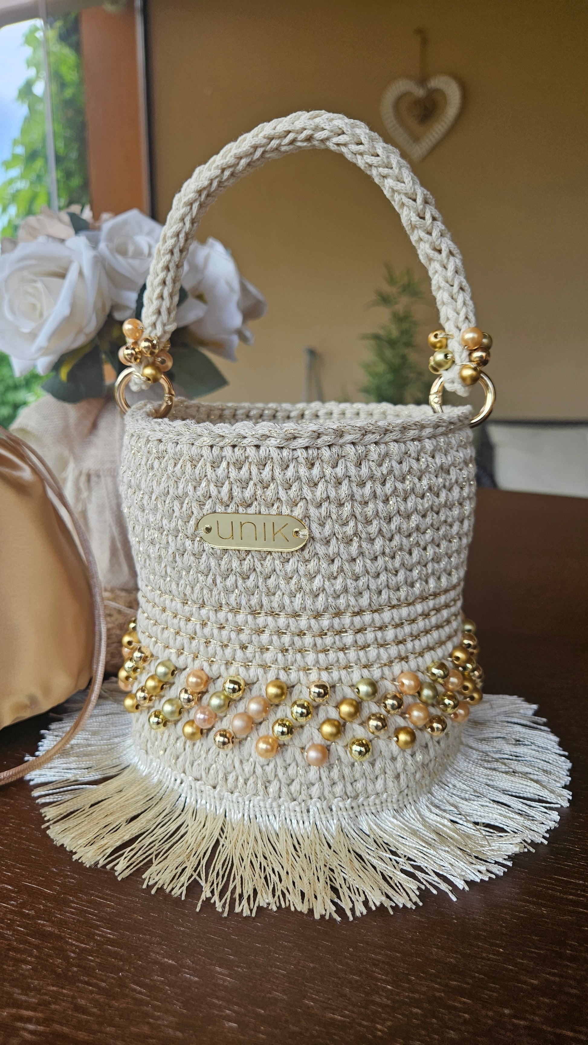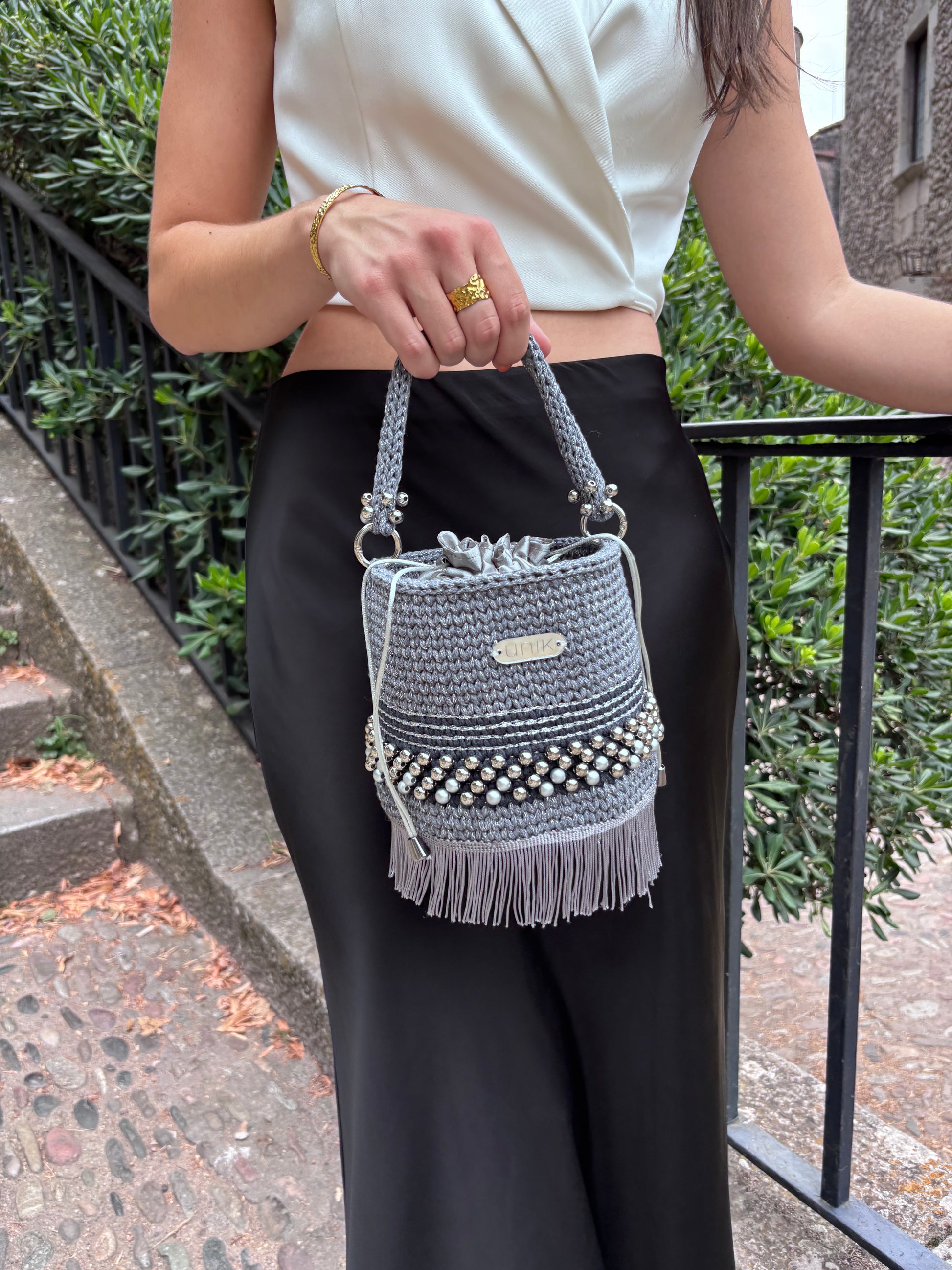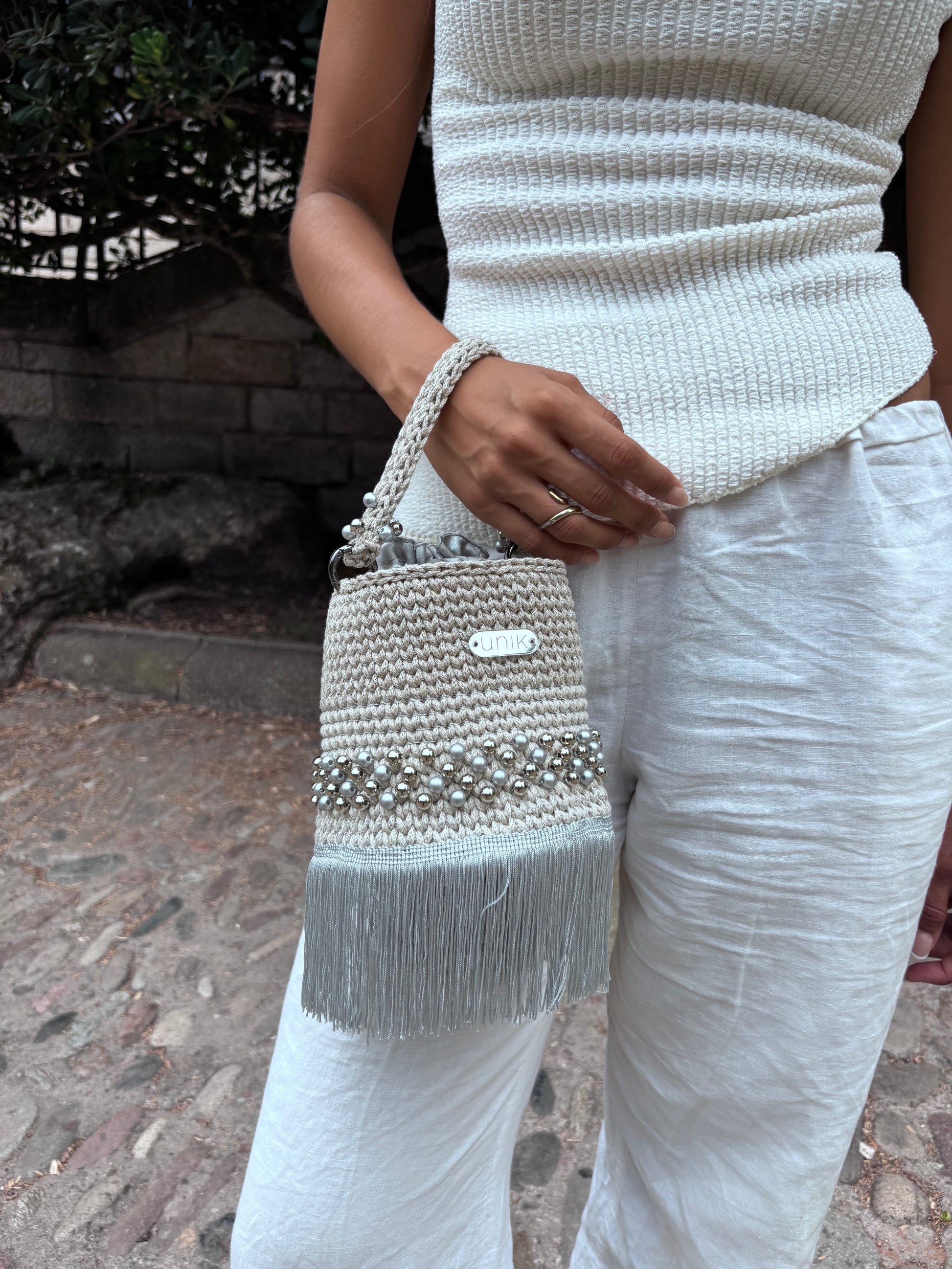 . Mides: 18 x 12 cm · Ansa de ganxet decorada · Bossa interior satinada · Etiqueta Unik |