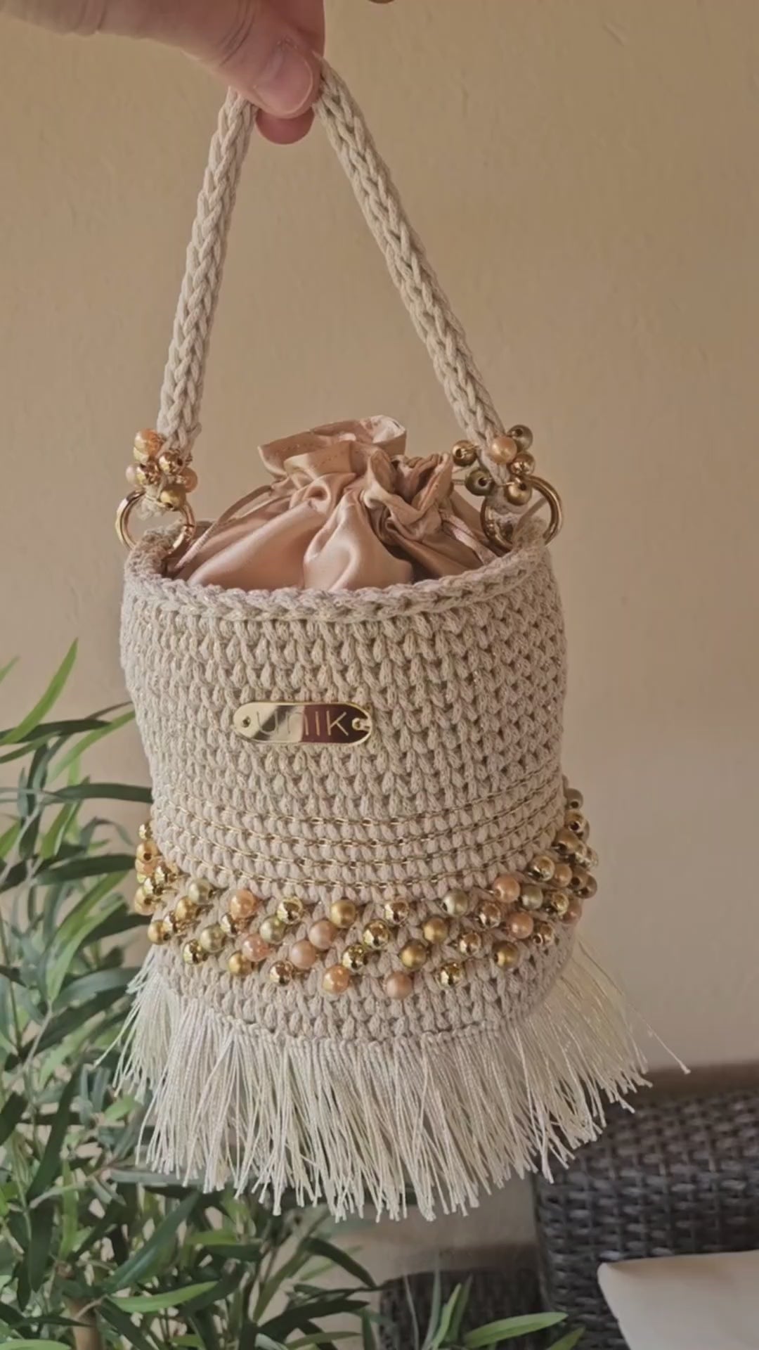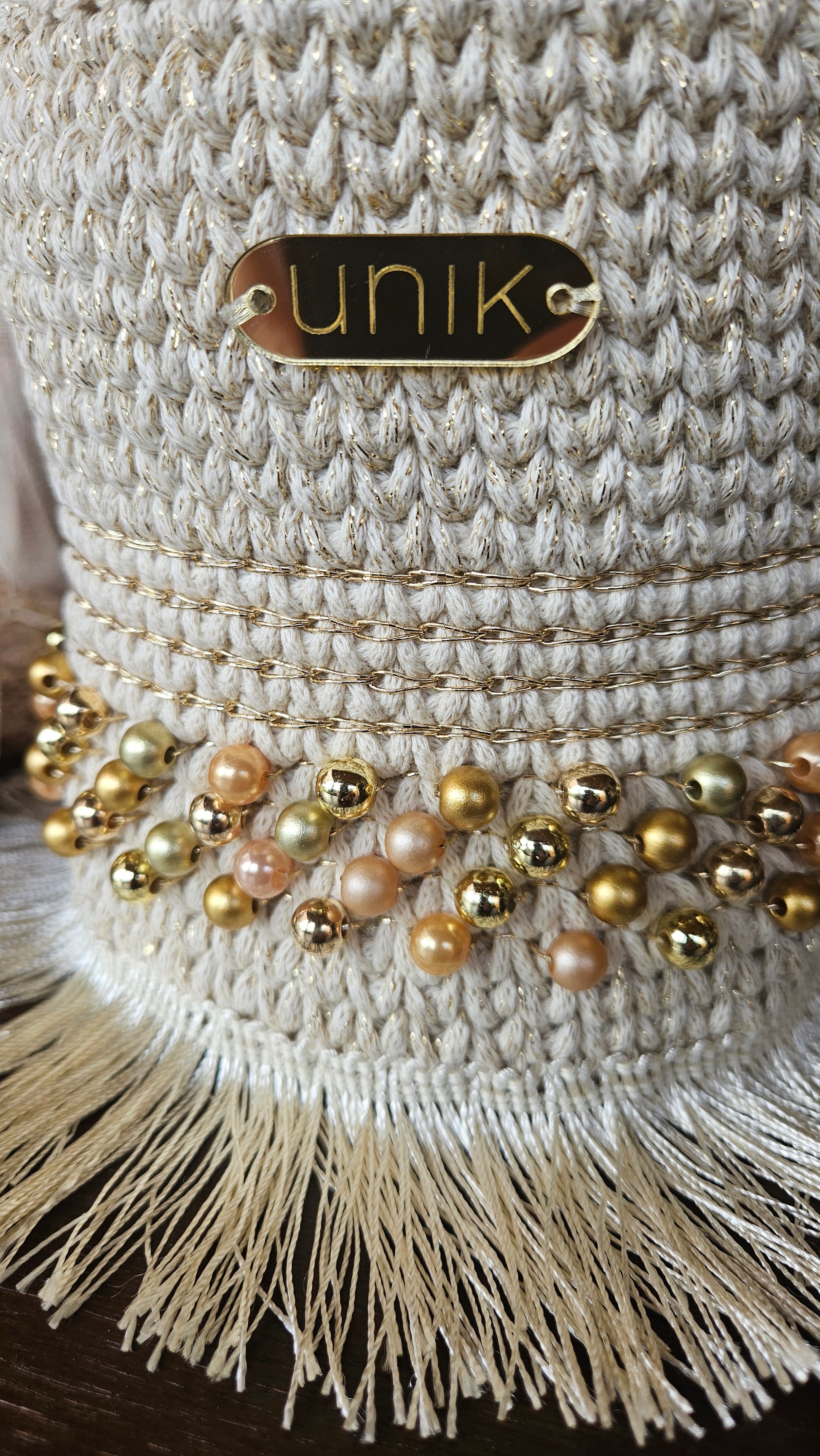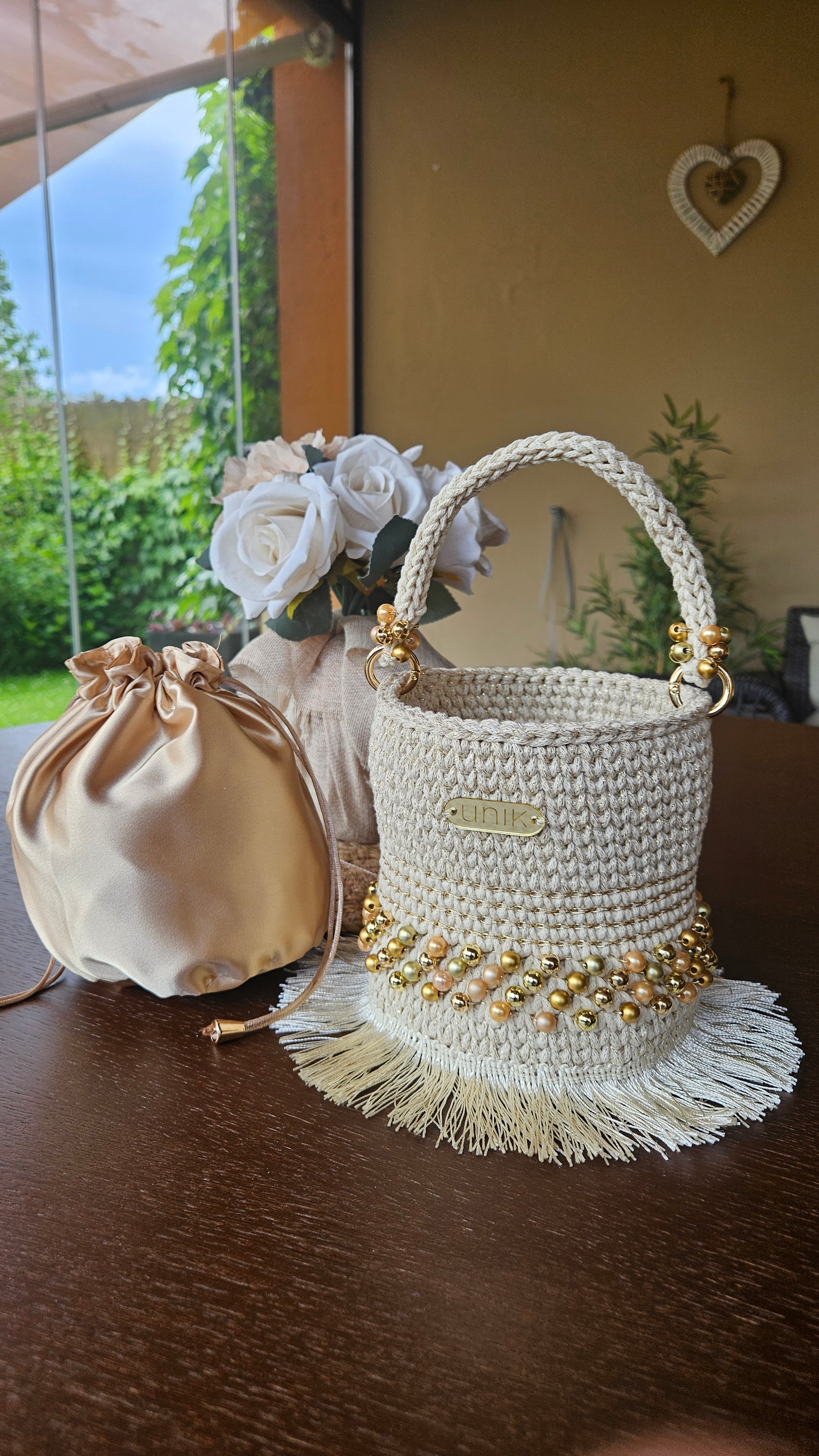 . Mides: 18 x 12 cm · Ansa de ganxet decorada · Bossa interior satinada · Etiqueta Unik |