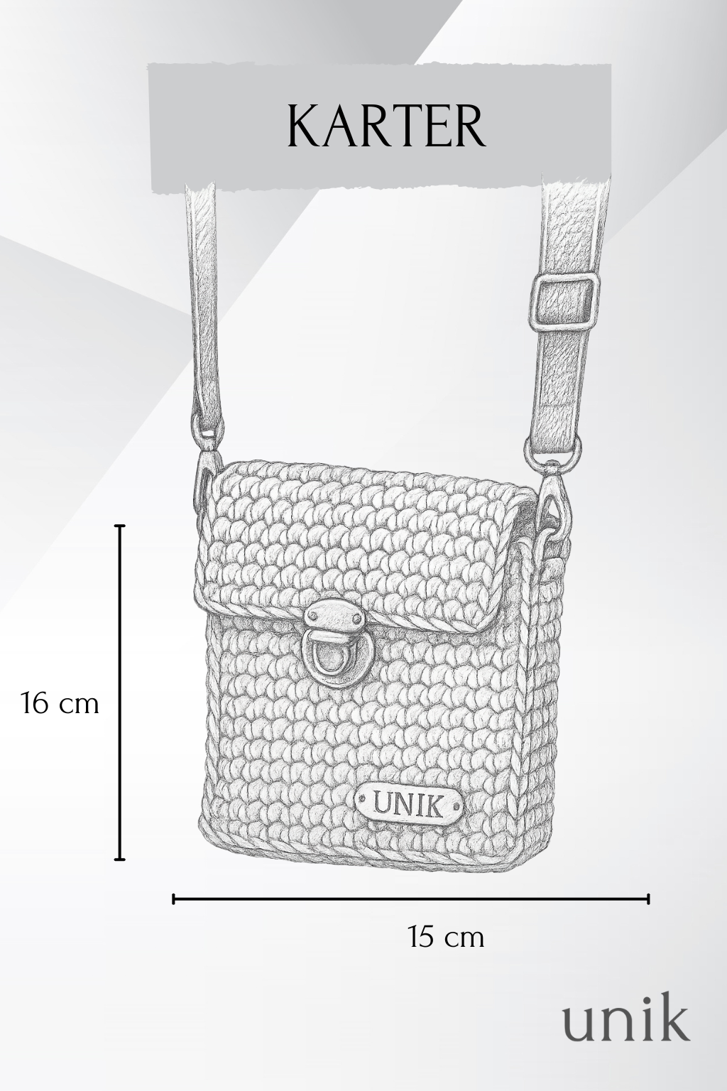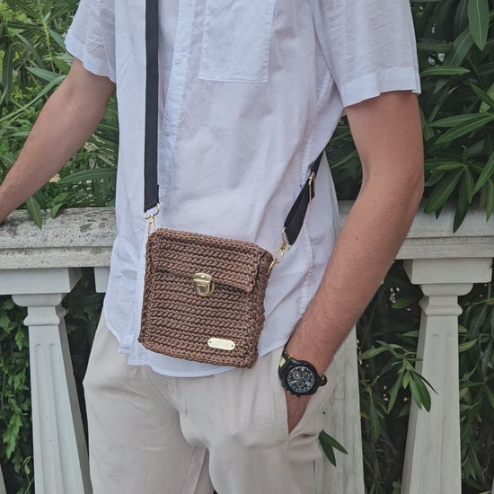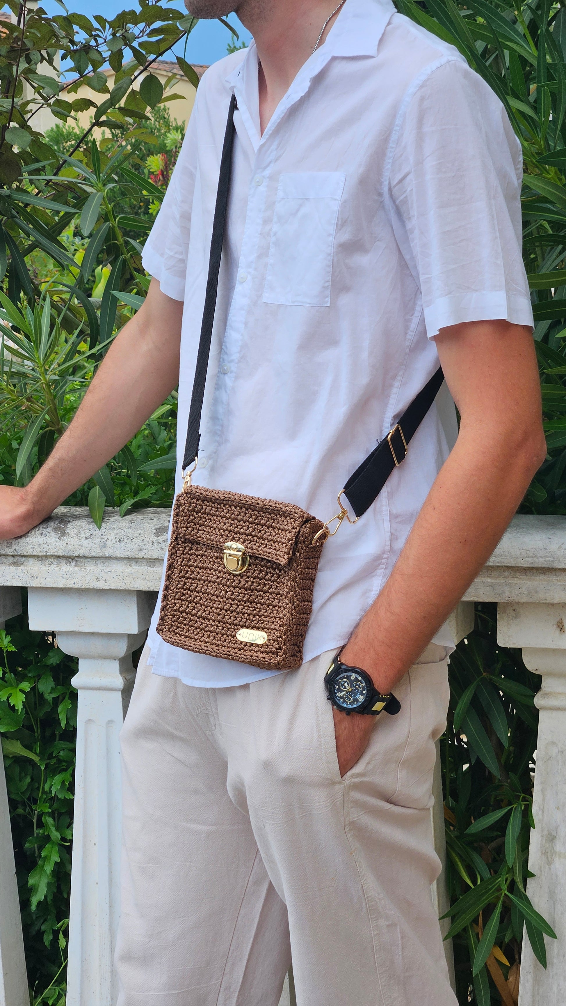 Teixit a mà amb fil de qualitat, aquest model destaca per la seva textura sòlida, el tancament metàl·lic daurat i la seva cinta regulable per portar-lo còmodament a l’espatlla o creuat.