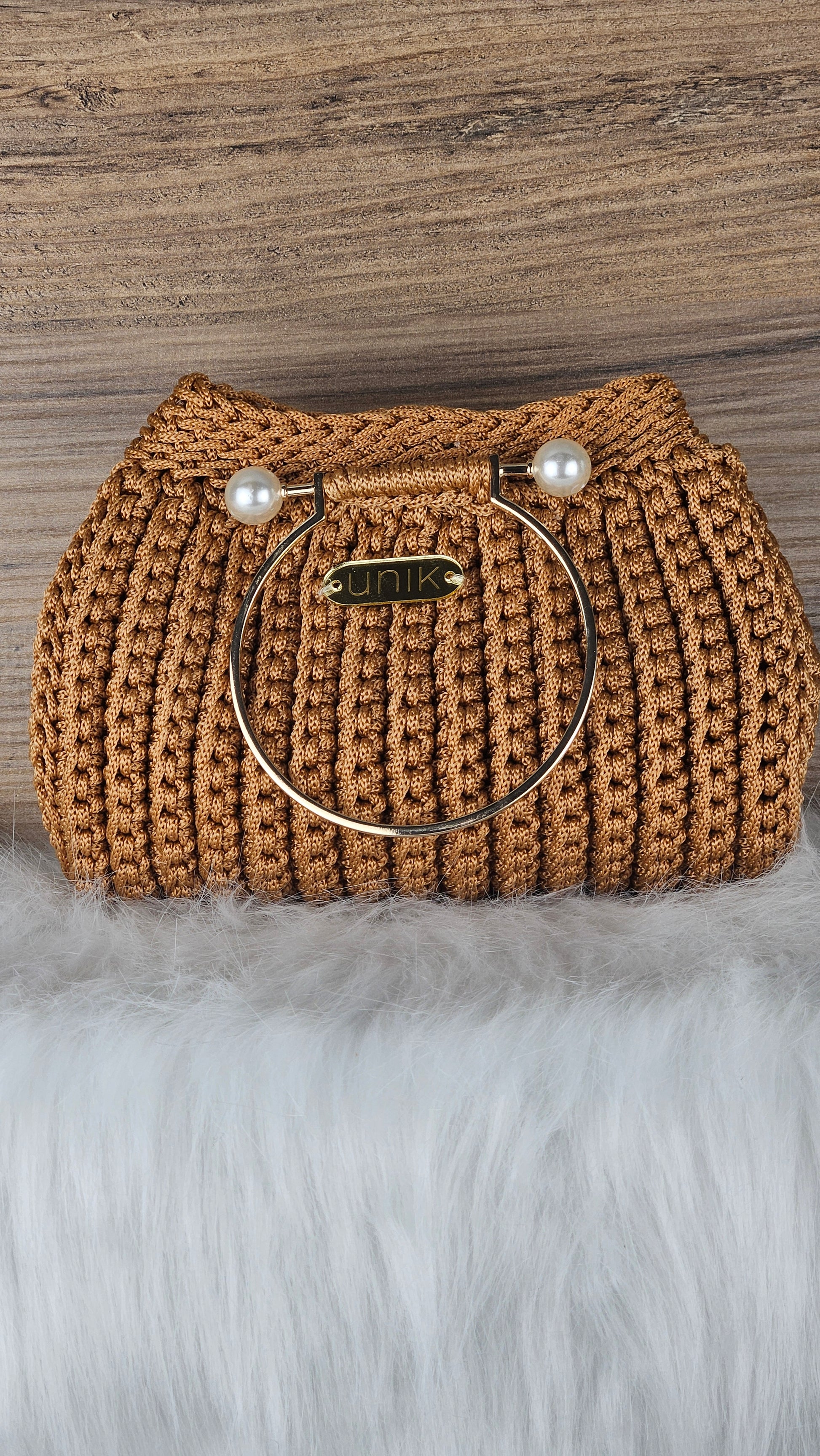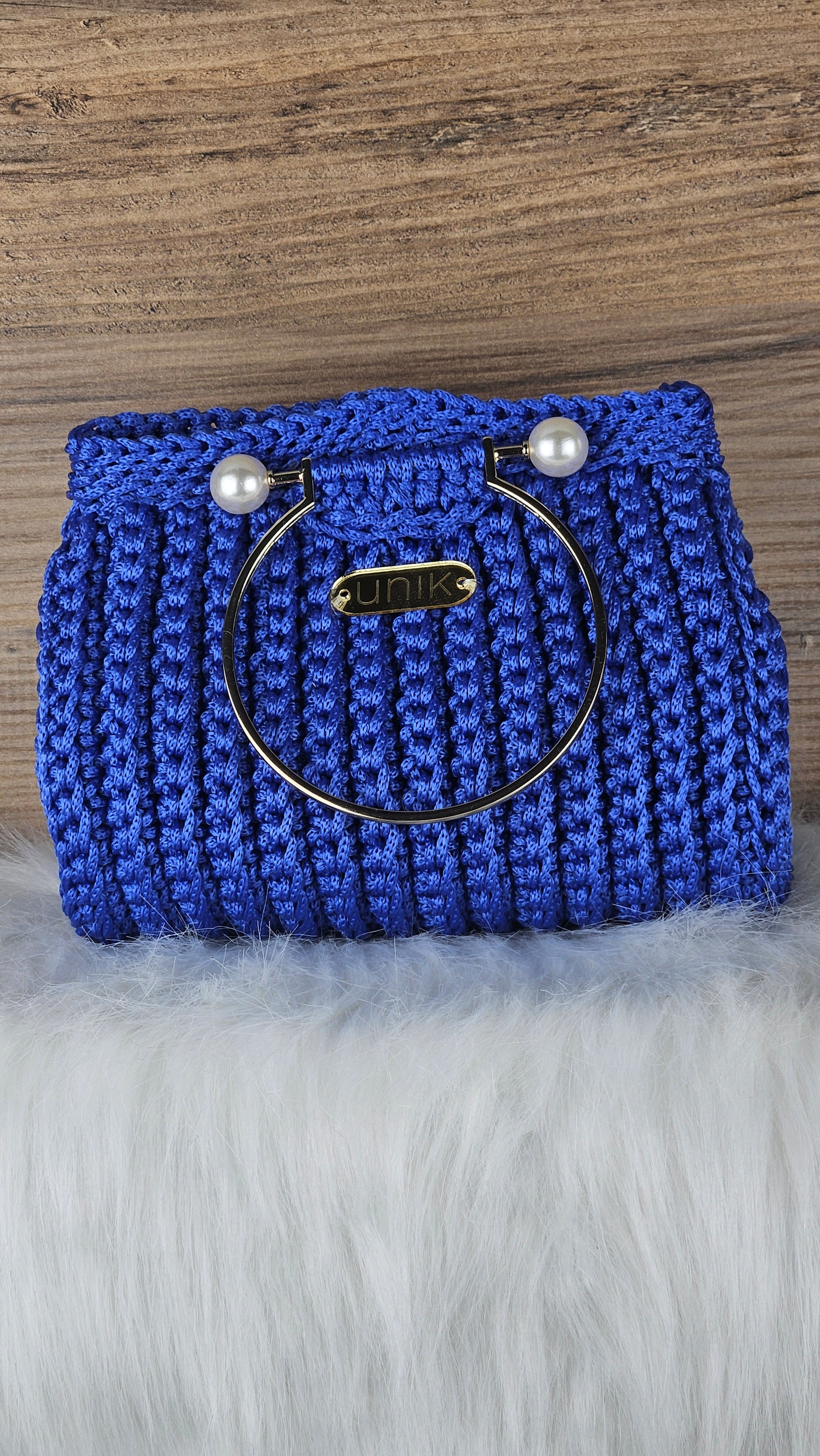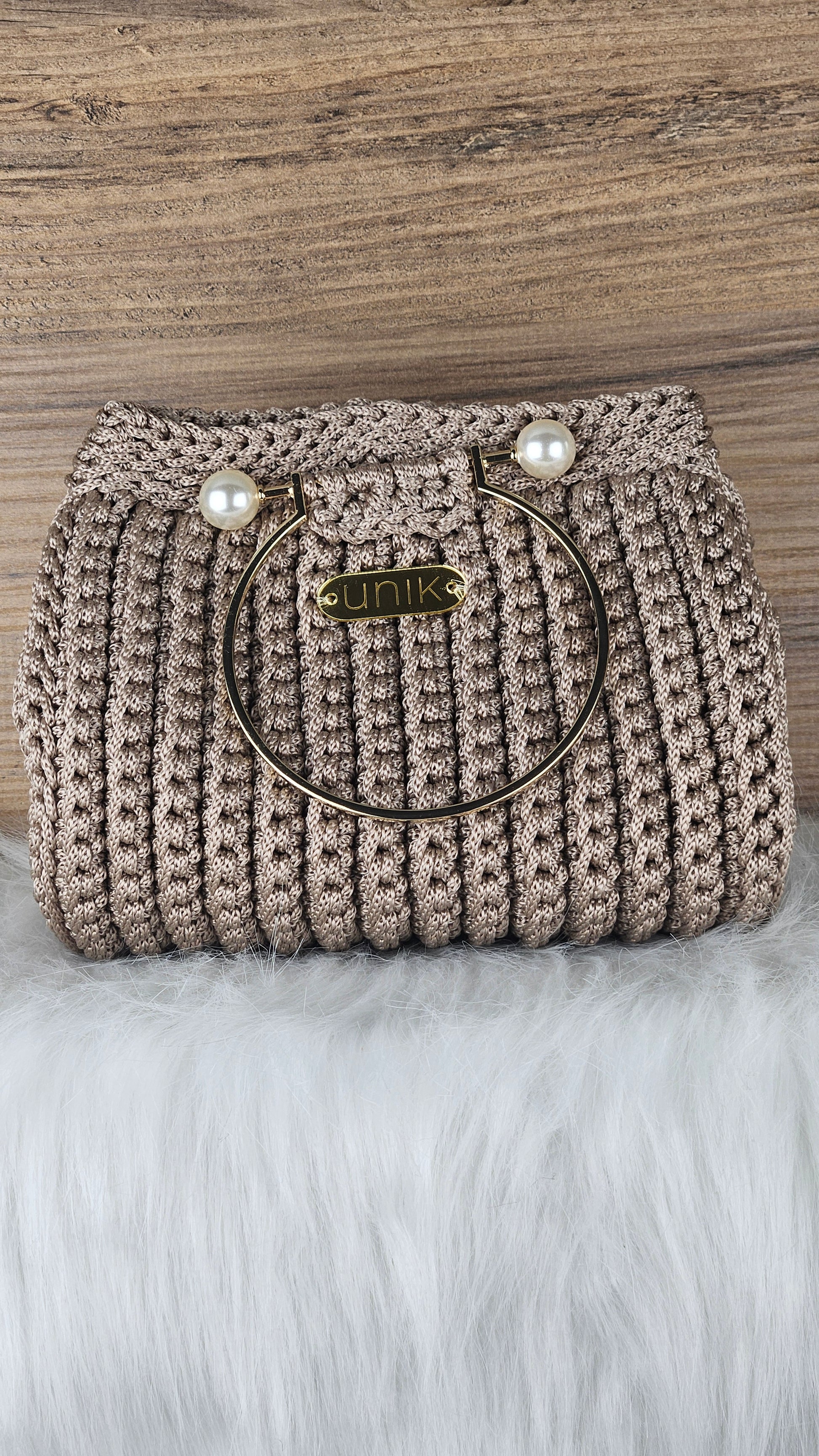. Mides: 20 x 15 cm · Fil nàutic · Folre interior satinat · Botó magnètic · 2 nanses metàl·liques daurades amb perles decoratives · Cadena metàl·lica daurada · Etiqueta Unik |