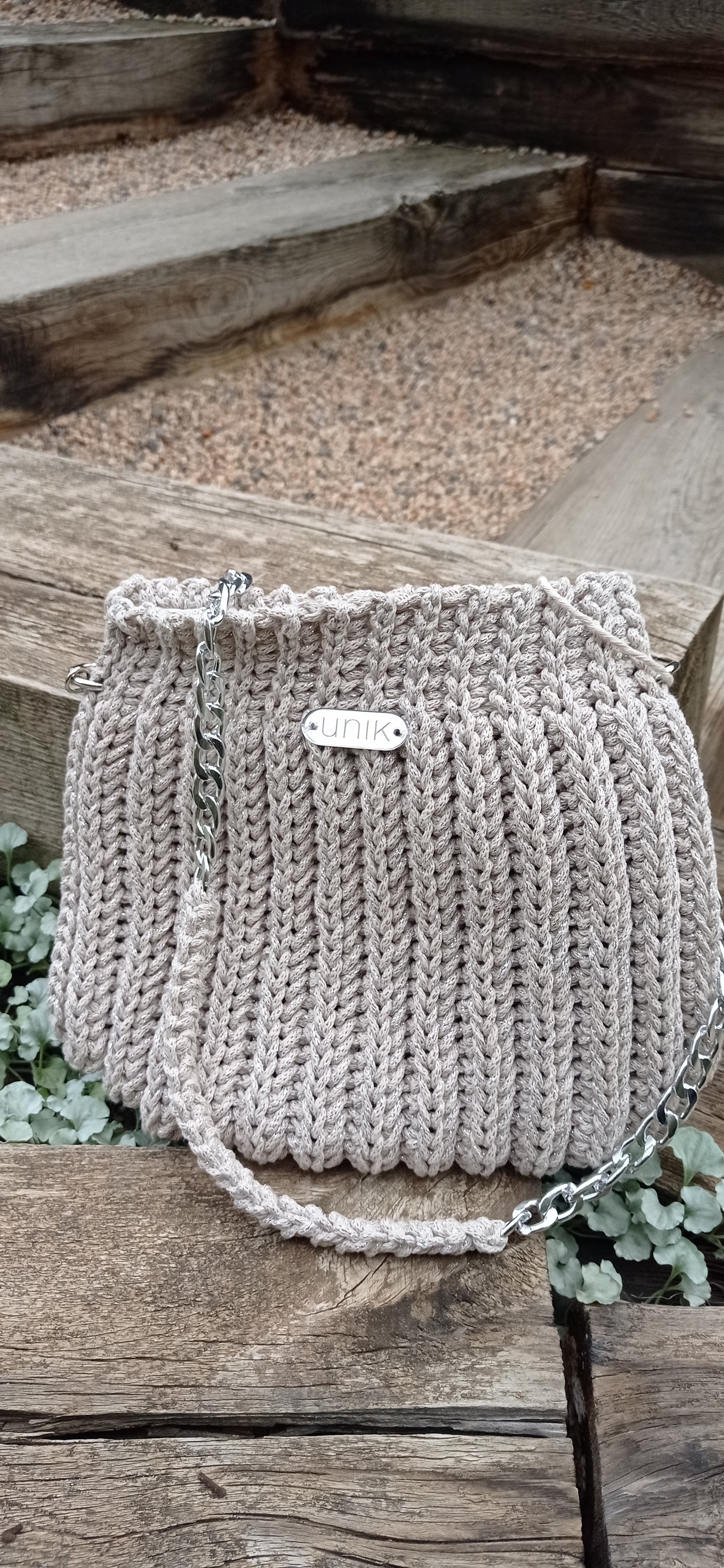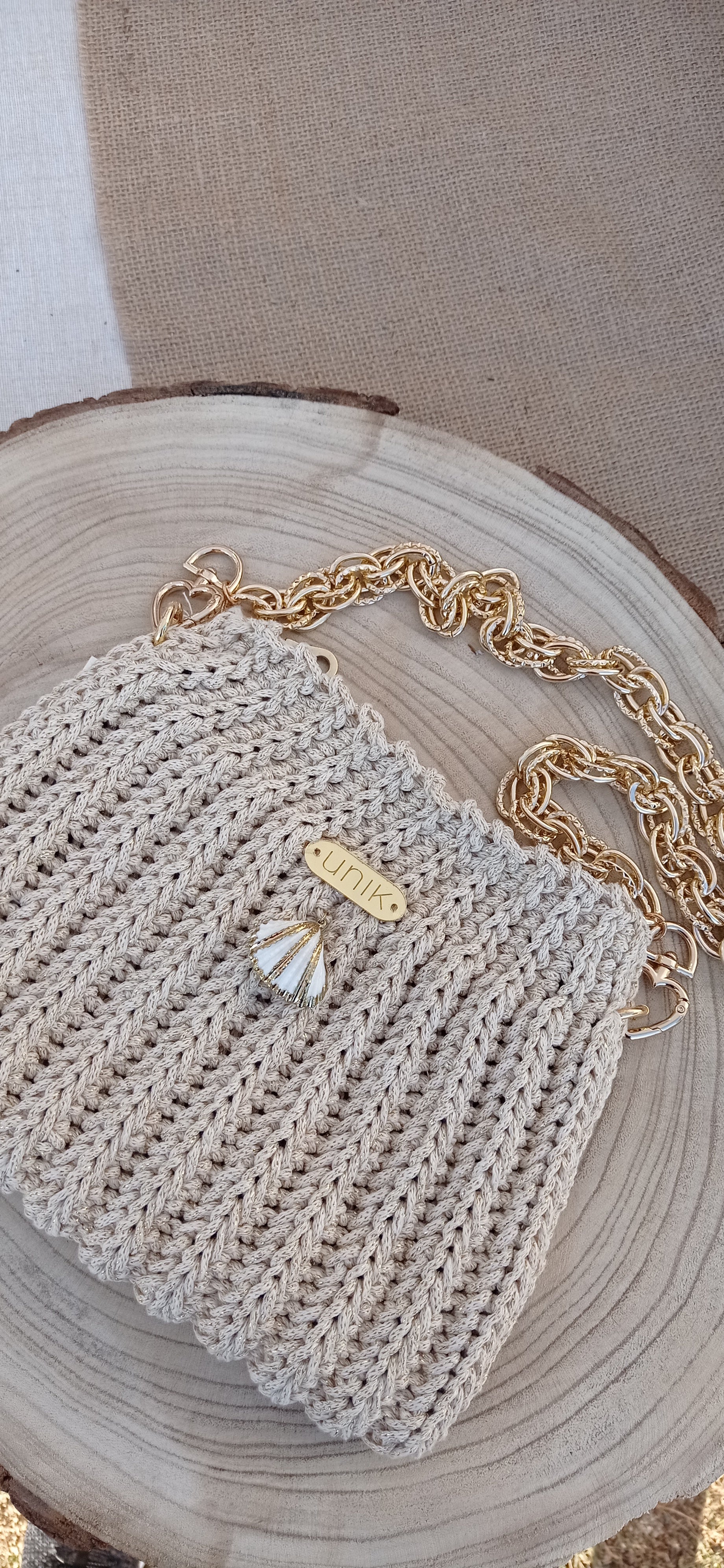 . Mides: 21 x 20 cm · Fil combinat beix i daurat · Folre interior beix · Cremallera beix · Cadena metàl·lica daurada combinada amb ganxet color beix · Etiqueta Unik |